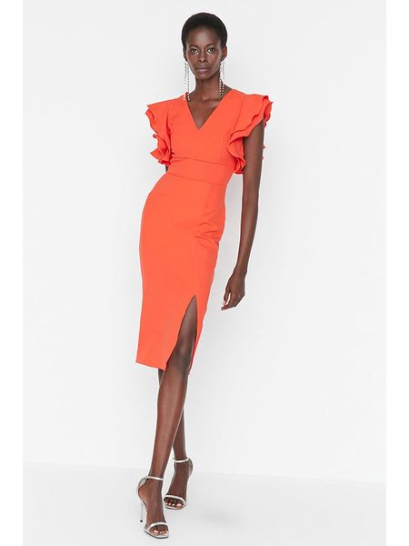 sukienki na imprezę sukienki bez rękawów sukienki z dekoltem na plecach sukienki midi sukienki bez kołnierzyka sukienki bez ramiączek odzież damska trendyol odzież damska limango.pl pomarańczowe sukienki sukienki ze sklepu limango.pl