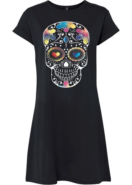 Luźniejsza sukienka shirtowa z kolorowym nadrukiem i krótkimi rękawami.