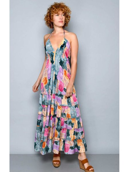 – dekolt: V- ramiączka: na szyję- detale: falbanki- krój: rozkloszowany- wzór: na całości
