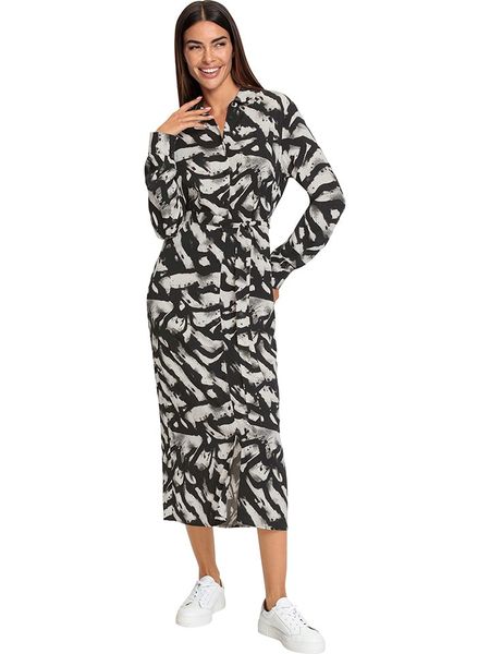 – czysta wiskoza- dekolt: V- zapięcie: listwa guzikowa- zakończenie rękawów: guzik- zdejmowany pasek: tkanina- dolny brzeg: 7/8- krój: taliowany- wzór: na całości