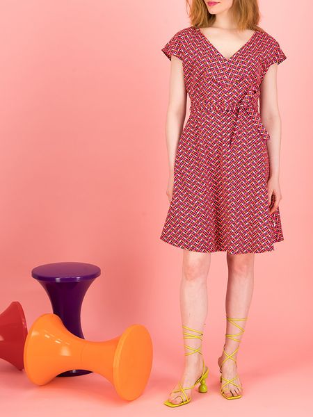 – z bawełny organicznej- dekolt: V- detale: nakładane rękawki- zdejmowany pasek: tkanina- krój: rozkloszowany- wzór: na całości