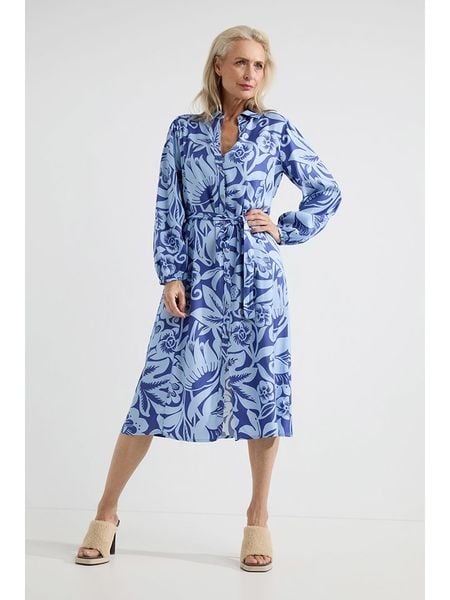 – czysta wiskoza- kołnierz: kent- zapięcie: listwa guzikowa- w talii wiązanie: tak- szlufki na pasek: tak- krój: prosty- wzór: na całości