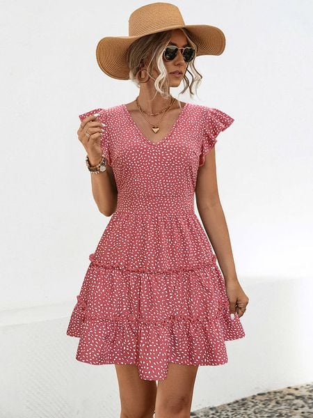 – dekolt: V- krój rękawów: motylek- dolny brzeg: z falbankami- detale: falbanki- krój: litera A- wzór: na całości
