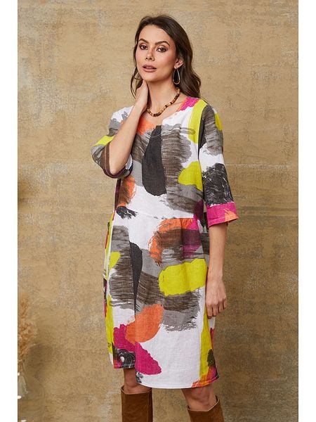 – czysty len- dekolt: okrągły- krój: luźny- wzór: na całości