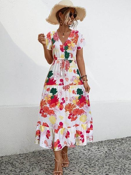 – dekolt: V- krój rękawów: motylek- talia: ściągacz tunelowy- dolny brzeg: z falbankami- detale: ozdobne guziki- krój: litera A- wzór: kwiatowy
