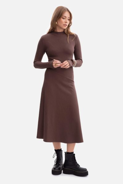 Bawełniana sukienka dzianinowa z golfem rozkloszowana brąz