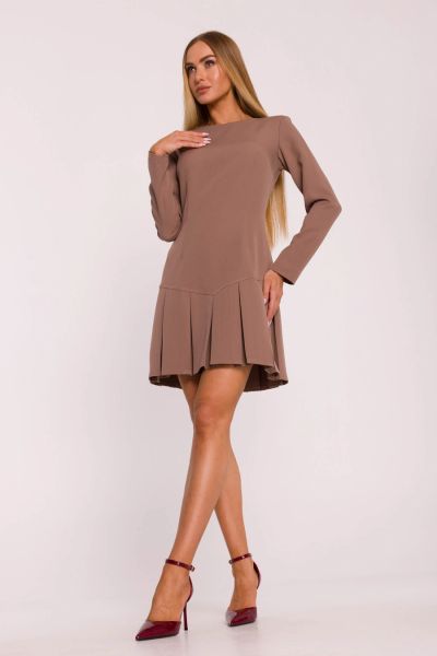 Elegancka krótka sukienka trapezowa z kontrafałdami brązowa