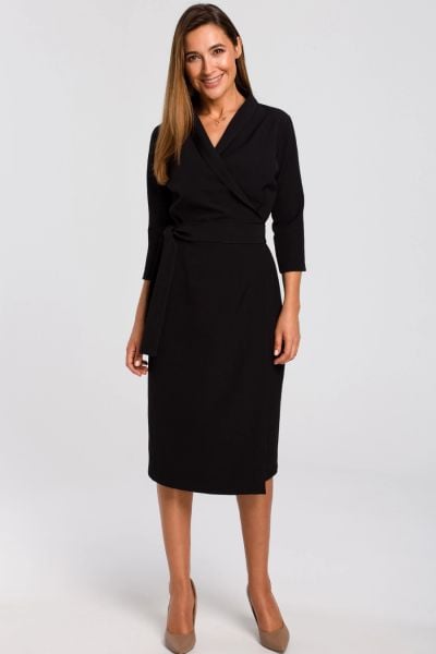 Elegancka sukienka biznesowa kopertowa midi z paskiem czarna