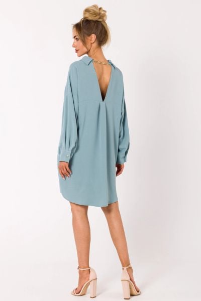 Sukienka – tunika jak koszula oversize z dekoltem i łańcuszkiem na plecach. Swobodny, zwiewny fason idealny dla luźnych stylizacji