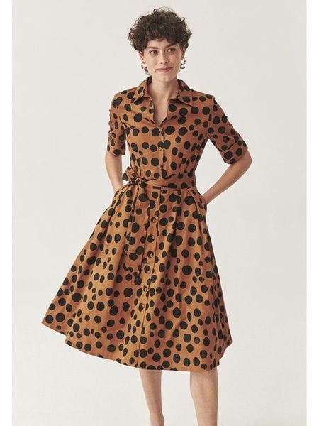 – czysta bawełna- kołnierz: kent- dekolt: V- zdejmowany pasek: tkanina- kieszenie: wpuszczane- krój: rozkloszowany- wzór: kropki