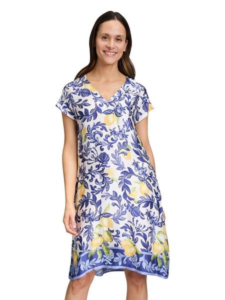 – czysta wiskoza- dekolt: V- kieszenie: wpuszczane- krój: luźny- wzór: na całości