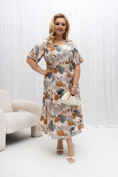 Lniana sukienka Lori w stonowane akwarelowe kwiaty na wesele PLUS SIZE XXL OVERSIZE WIOSNA