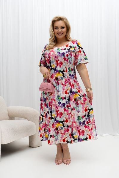 Lniana sukienka Lori z kolorowym akwarelowym motywem na wesele PLUS SIZE XXL OVERSIZE WIOSNA