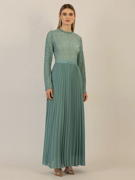 – kołnierz: stójka- zapięcie: suwak na plecach- długość rękawa: długi- detale: plisy, szydełkowana koronka- krój: litera A- look: jednokolorowy