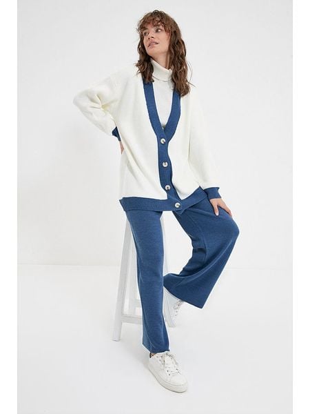 W zestawie:Kardigan:- dekolt: V- zapięcie: listwa guzikowa- ściągacz: dekolt, zakończenia rękawów, dolny brzeg- krój: luźny- wzór: colour blockingSpodnie:- pas: elastyczny- krój: luźny- look: jednokolorowy