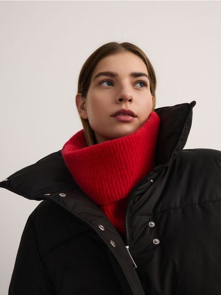 Szal z wysokim golfem wykonany z miękkiej dzianiny.
