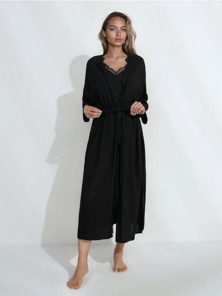 Sinsay – Wiskozowy szlafrok z koronkowym wykończeniem – czarny –